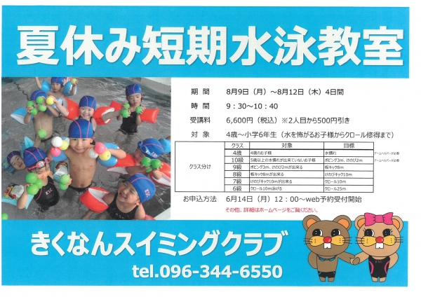 夏休み短期水泳教室のお知らせです。