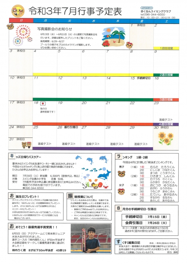 7月の行事予定表です。7月はキッズイベントとしてイルカウォッチングを実施します。春休みにも行いましたがとても好評でしたのでぜひお申込みください。また、7月は進級テストが行われます。練習をお休みしないようにお願いします!