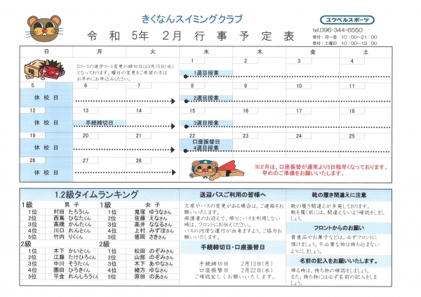 2月行事予定表です。今号よりキッズ会員の皆様にはメールにて配信しております。大人会員の皆さま、紙でほしい子ども会員の皆さまはフロントにて準備しておりますのでご自由にお取りください。寒い日が続いておりますが、風邪・インフルエンザに注意してお過ごしください。