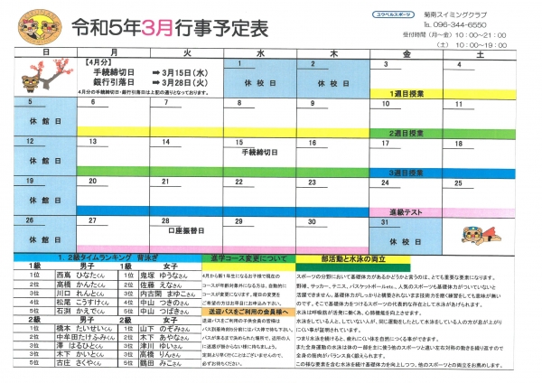 3月分行事予定表です。卒業の季節になりました。進学に備える時期でもあります。新年度に向けてしっかり準備を整え、新たな出会い、新たなチャレンジを楽しみましょう!!