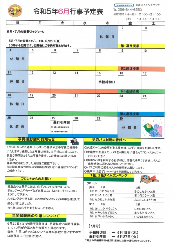 6月分の行事予定表です。今年は梅雨入りするのがちょっと早いようですね。そして学校では水泳の授業が始まります!スイミングで練習した成果を発揮してクラスのヒーロー目指してください!!