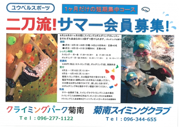 菊南スイミングの水泳レッスン3回とクライミングパーク菊南のボルダリングレッスンを3回の計6回の二刀流レッスンを1ヶ月の間に受講できるコースです。