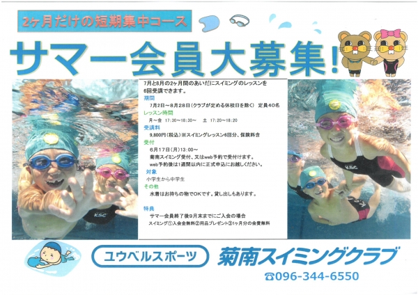 夏休みの間に「水泳を上達したい」「運動不足解消」「新しい事に挑戦したい」などなど、きっかけはそれぞれだと思いますが、お子様が充実した夏休みを過ごせるよう菊南スイミングがお手伝いします。