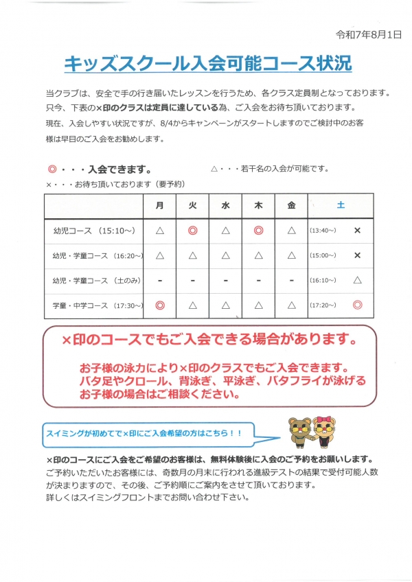 8月4日(月)から特大入会キャンペーンがスタートします!各コース定員制でレッスンを行っていますので、定員に達しますと入会待ちになります。表をご確認いただきお早めにご入会のお手続をお願い致します。尚、ご入会のお手続は20分ほどお時間を頂戴いたします。必ずお電話にて事前予約をお願い致します。