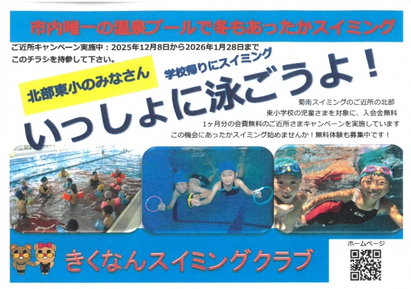 今もたくさんの児童のみなさんが泳ぎに来てくれていますが、1月28日までにご入会頂くと?入会金無料(3,300円)?1ヶ月分の会費無料(6,590〜8,240円)のお得なキャンペーンを実施しています!※管理手数料(825円)水着(2,680円〜4,880円)キャップ(1,100円)でご入会できます。